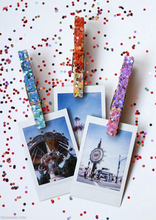 این روش شاید برای فضاهای خصوصی مثل اتاق ، مناسب تر از فضای نشیمن خانه باشد. کافیست تعدادی گیره لباس تهیه کنید و آن را به سلیقه خودتان تزیین کنید. سپس به پشت آنها یک پونز بزنید تا روی دیوار نصب شوند. بعد تنها کافیست عکس هایتان را بین آنها قرار دهید.